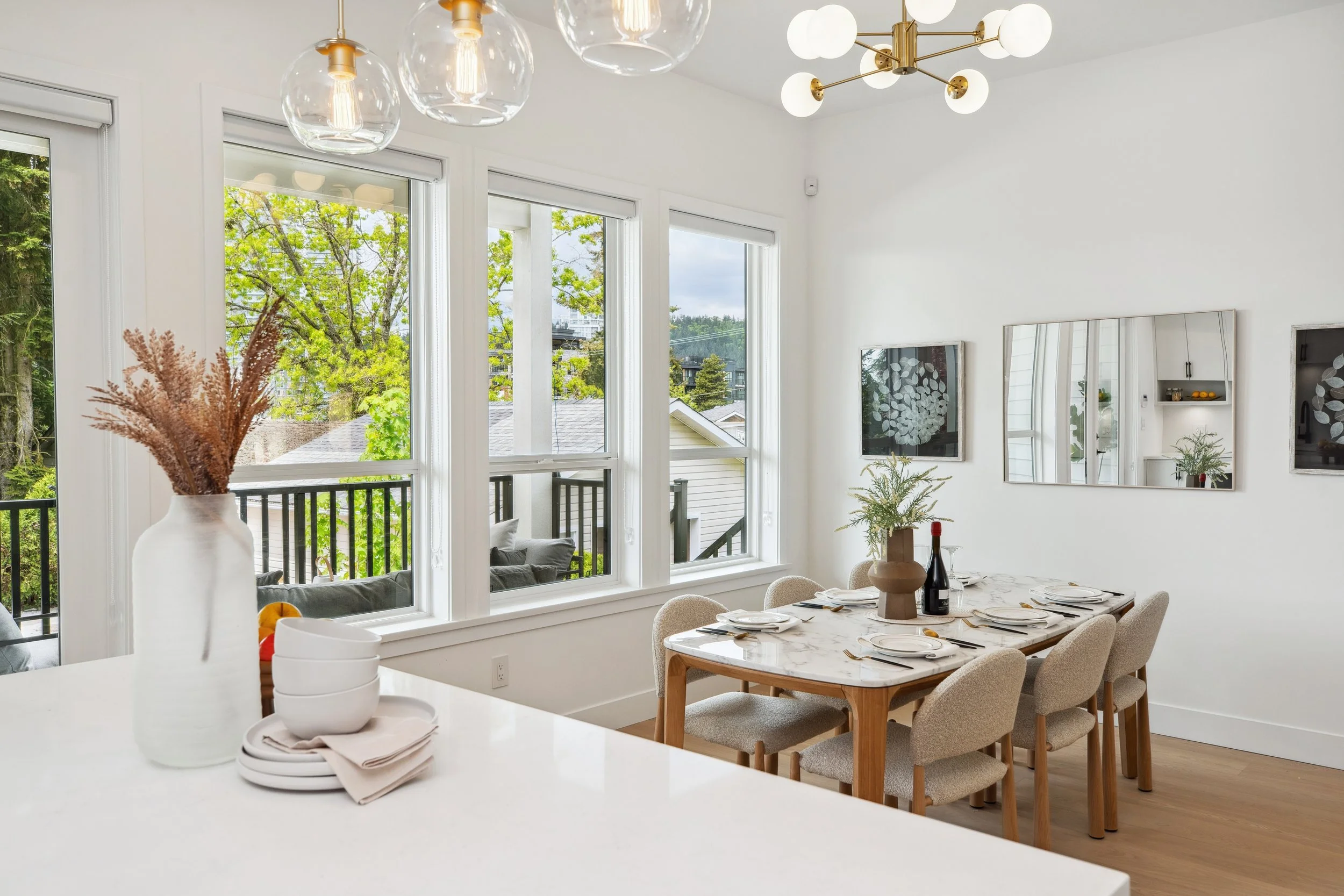 Bright dining area with large windows, a marble-top dining table set for six with plates, cutlery, and wine glasses, and modern light fixtures.